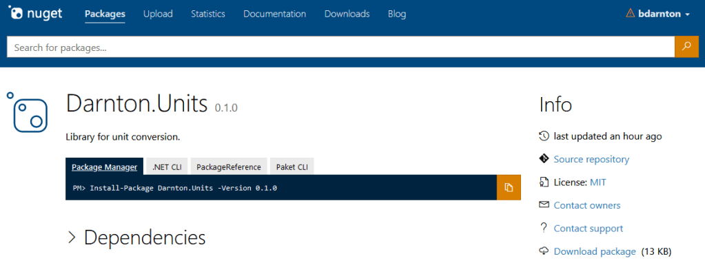 To publish the package to the world, create an account at nuget.org, or log in with your Microsoft account and upload. My tiny package for converting timestamps is here: Darnton.Units.
