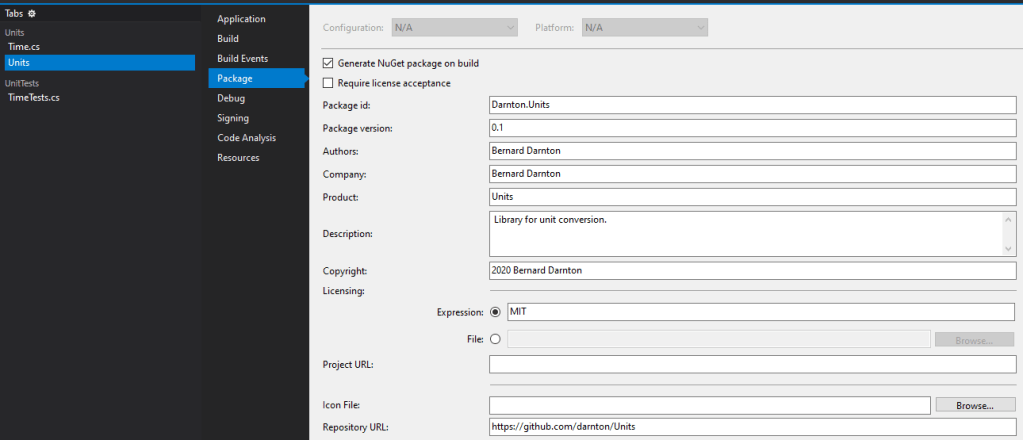 Creating the NuGet package is easy. Go to the Package section of the project properties and tick the ‘Generate NuGet package in build’ box. If you want to share it publicly, add your name and select a licence.