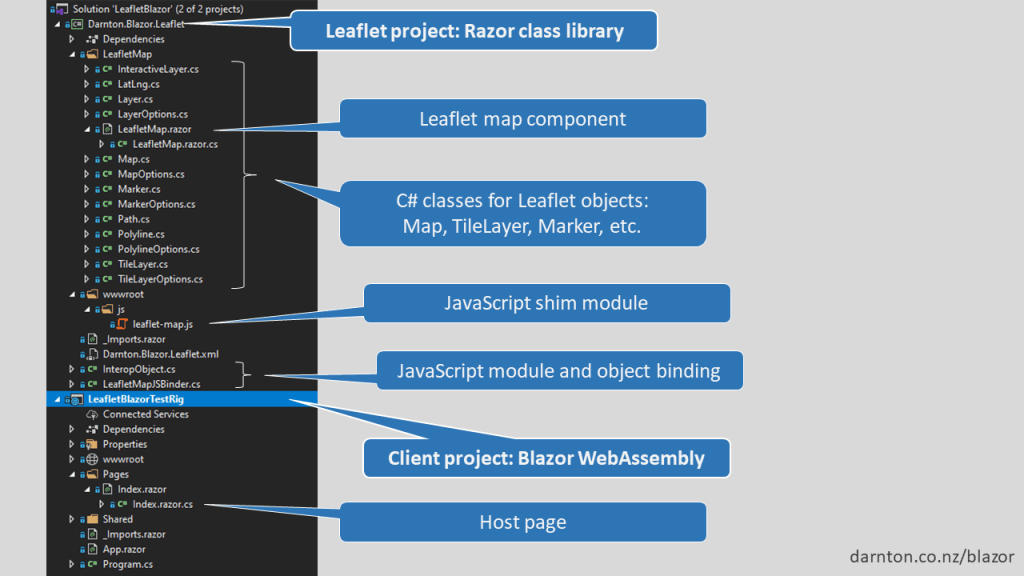 The demo solution (available on GitHub: LeafletBlazor) has two projects. The Darnton.Blazor.Leaflet project contains the LeafletMap component, all the domain classes, and the JavaScript interop magic. This is what ends up in the NuGet package. The second is a Blazor WebAssembly project, which contains a page hosting the Map component.