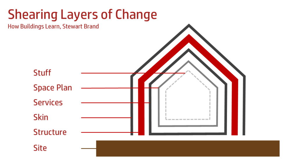 Buildings have parts that change at different rates. The site is permanent. The structural parts of buildings last from decades to centuries. The roof and cladding may last a few decades; wiring and plumbing something similar. The layout changes more often, and the “stuff” in the building changes constantly.