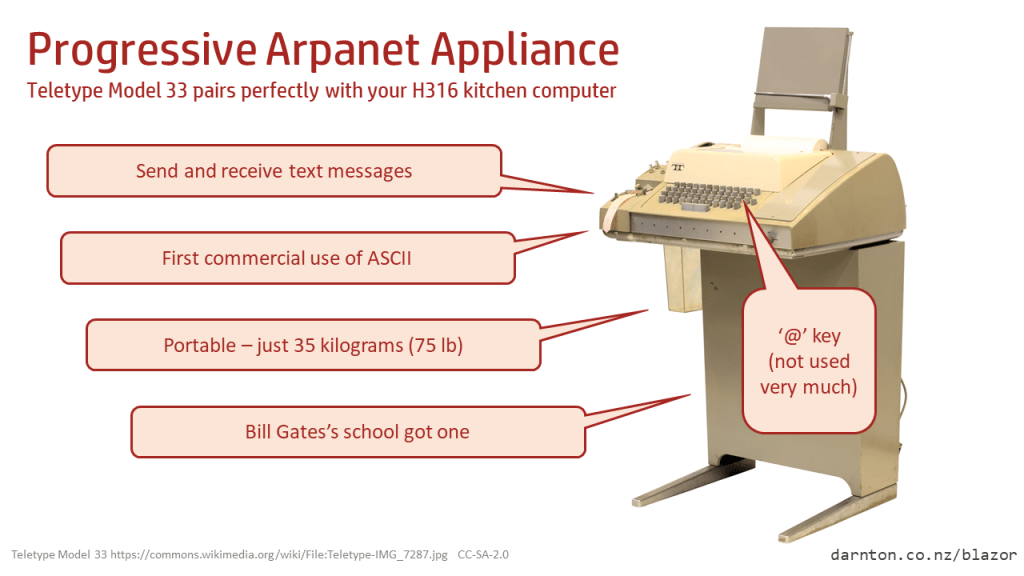 In the olden days, like 1969, if you wanted to program the H316 in your kitchen, you had to learn FORTRAN IV and punch it into a teletype. The Model 33 teletype used ASCII so that several other machines could understand it, and some H316s were plugged into the early Arpanet, but the dream of true interoperability still had a way to go.