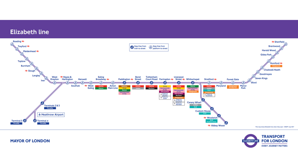 The Elizabeth Line is a new railway line running from commuter towns west of London and Heathrow airport, right under central London, and out to commuter towns in the East.