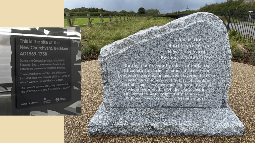 A huge number of plague victims were buried in the New Churchyard at Bethlem, perhaps up to 20,000. Around 3,500 bodies were exhumed from the site of Liverpool Street station.